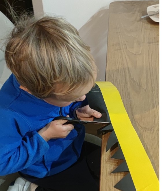 Čtvrtku naměříme na velikost hlavy a přidáme pár centimetrů nadměrek. Na spodní část čtvrtky nalepíme lepící pásku. Zatím neodstraňujeme folii z druhé strany pásky. Nad pásku načrtneme hroty korunky a vystřihneme je. Korunka je připravená ke zdobení. Tak hurá do lesa!