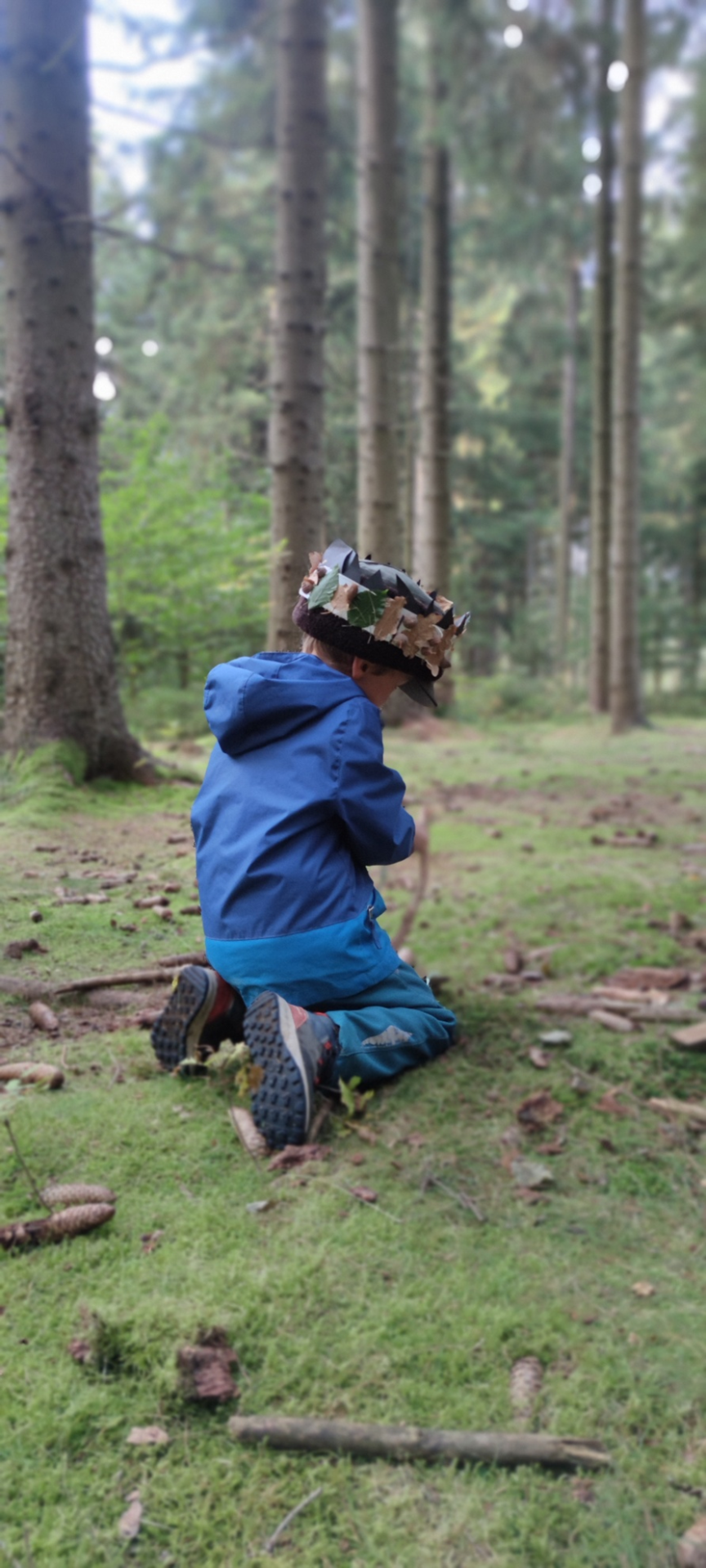 Při procházce v lese nebo na louce si posbíráme přírodniny. Na korunku se hodí listy, peříčka, tráva, květy, větvičky, žaludy, šišky, kamínky…. Až budeme mít potřebný materiál nasbíraný, najdeme si pěkné místečko, odlepíme ochranou pásku z oboustranné lepící pásky a pustíme se do zdobení.